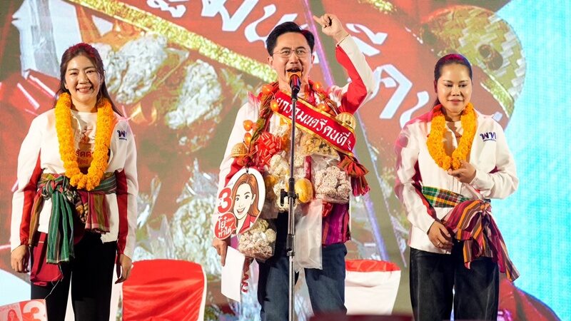 นายยศชนัน ขึ้นเวทีปราศรัยช่วย 2 ผู้สมัคร สส. พรรเพื่อไทยหาเสียง