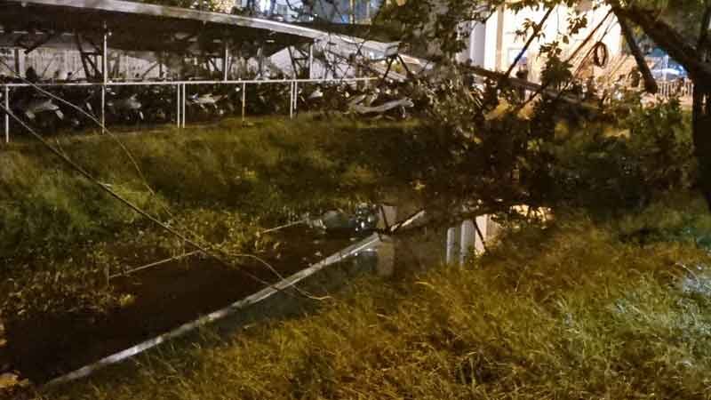 นนทบุรีอ่วม ฝนถล่มลมซัด ต้นไม้-เสาไฟล้ม ป้ายโฆษณาปลิว ผนังห้างพังเสียหาย