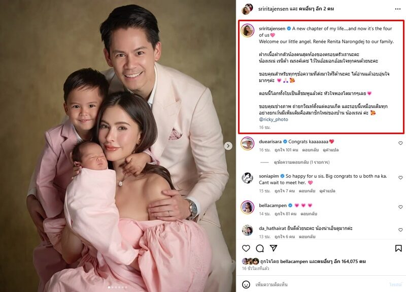 โดยเผยแคปชั่นต้อนรับ น้องเรเน่ สู่ครอบครัว พร้อมชื่อจริงเพราะมากๆ ด้วยว่า “A new chapter of my life…,and now it’s the four of us Welcome our little angel, Renée Renita Narongdej to our family.”