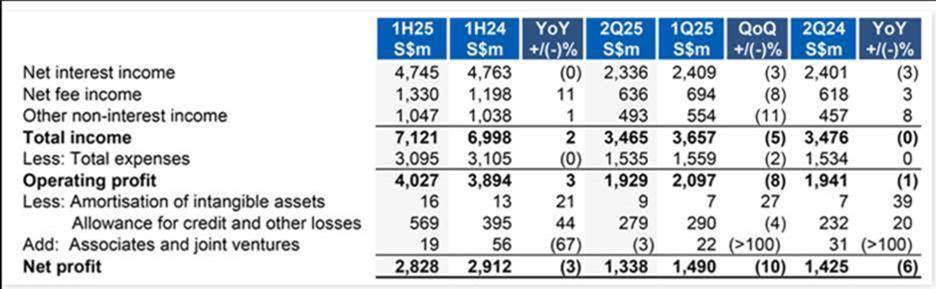 ผู้สื่อข่าวรายงานว่า กลุ่มธนาคารยูโอบี ประกาศผลกำไรจากการดำเนินงานในช่วงครึ่งปีแรกของปี 2568 (1H25) อยู่ที่ 4.0 พันล้านเหรียญสิงคโปร์ เพิ่มขึ้นร้อยละ 3 เมื่อเทียบกับช่วงเดียวกันของปีก่อนหน้า โดยได้รับแรงหนุนจากการเติบโตของรายได้ค่าธรรมเนียมในหลายกลุ่มธุรกิจอย่างต่อเนื่องเป็นเลขสองหลัก ขณะที่กำไรสุทธิลดลงร้อยละ 3 อยู่ที่ 2.8 พันล้านเหรียญสิงคโปร์ เนื่องจากการตั้งสำรองทั่วไปเชิงป้องกันเพื่อรับมือกับความไม่แน่นอนทางเศรษฐกิจ