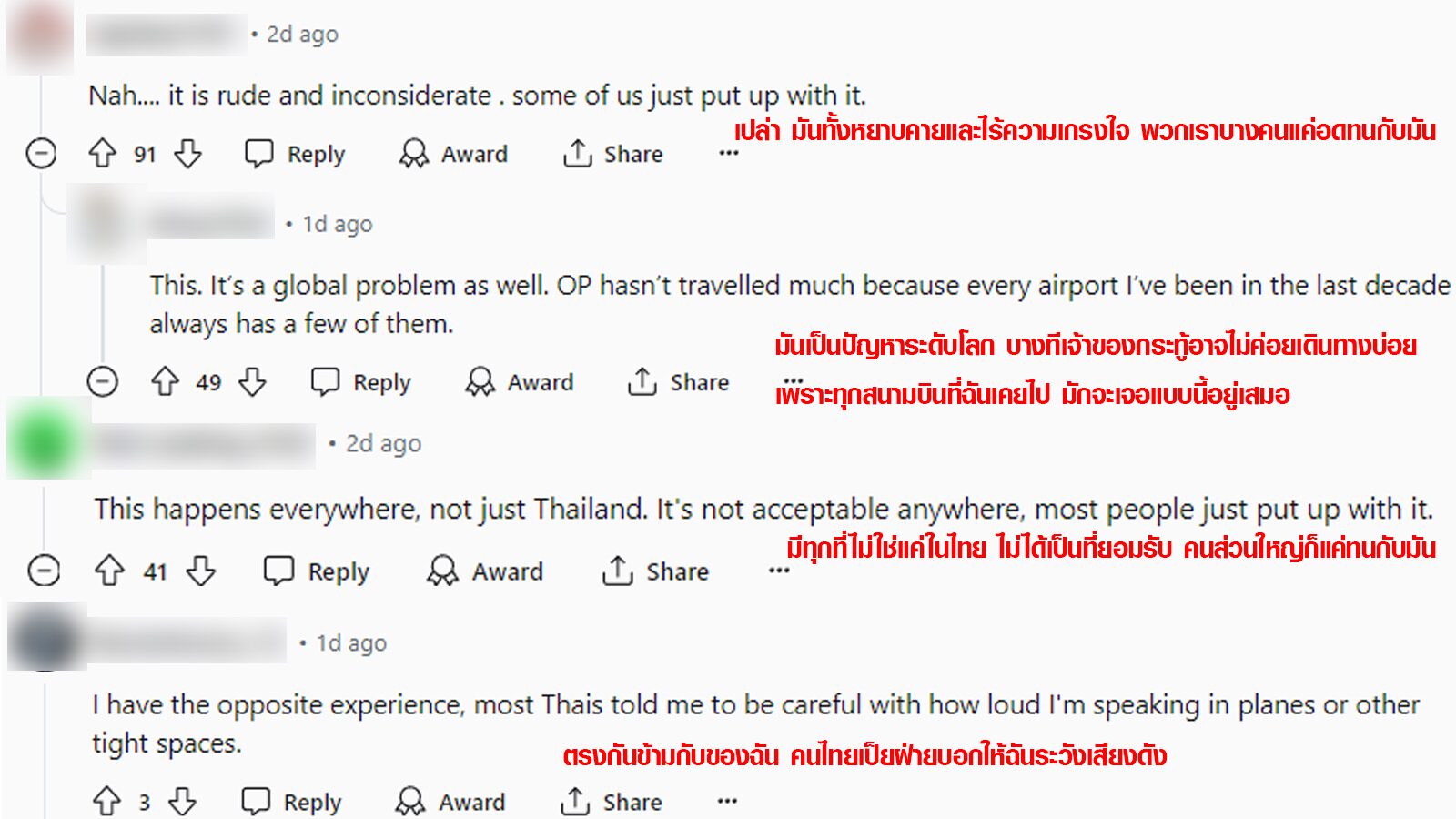 โดยมีชาวเน็ตรายหนึ่งให้ความเห็นว่า คนไทยอดทนเก่งและสามารถทนต่อเสียงรบกวนได้สูง พร้อมยกตัวอย่างครอบครัวของภรรยา ภายในห้องมีคนอยู่หลายคน โดย 3 คนกำลังนอน มี 2 คนนั่งคุยเสียงดัง และอีก 2 คนเล่นโทรศัพท์เสียงดัง นอกจากนี้คนไทยยังมีความสามารถเหนือมนุษย์ สามารถหลับได้ทุกที่และรวดเร็ว เขาจึงคิดว่าความสามารถเหล่านี้มาพร้อมกับความสามารถในการเมินเฉยต่อเสียง