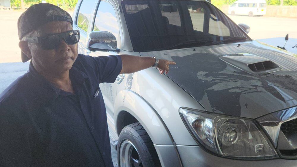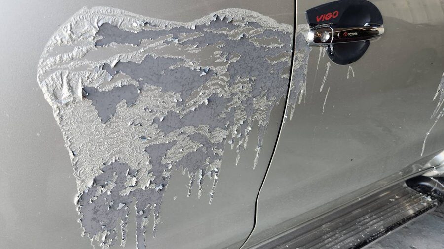 หนุ่มสุดเซ็ง จอดกระบะหน้าบ้าน เจอมือดี สาดน้ำยาลอกสี ใส่ หลุดเป็นแถบร่อนเป็นชิ้นๆ ค่าซ่อมเบื้องต้นประมาณ 50,000 บาท ตร.เร่งล่าตัวคนร้าย