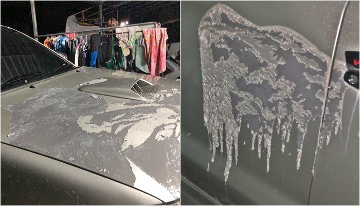 ตอนนั้นรถยังปกติอยู่เข้าบ้านแต่งตัว เพื่อจะไปทำงาน พอเปิดประตูรู้สึกมีกลิ่นเหม็นพอออกไปดูก็เห็นที่ฝากระโปรงรถมีคราบสีขาวๆ ก็เลยเปิดไฟดู ก็เห็นว่าตัวถังรถมีสีลอกอยู่หลายจุดก็เลยแจ้งประกัน และร้อยเวร สายตรวจ ให้มาตรวจสอบ