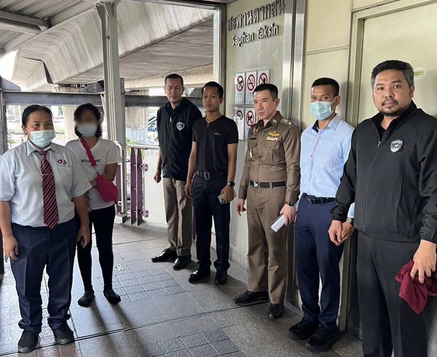 จึงร่วมกับฝ่ายรักษาความปลอดภัยของสถานีรถไฟฟ้า BTS และเจ้าหน้าที่ตำรวจฝ่ายสืบสวน ติดตาม เฝ้าระวังจนกระทั่งต่อมาเจ้าหน้าที่ พบเห็นหญิงซึ่งมีลักษณะตรงกับคนร้าย เดินอยู่ภายในสถานีรถไฟฟ้า BTS ตากสิน เจ้าหน้าที่ตำรวจจึงขอตรวจสอบพบว่า มีตำหนิรูปพรรณคล้ายกับคนร้ายจริง