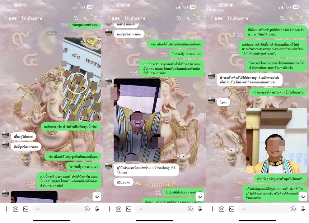 เจ้าของโพสต์จึงทักไปสอบถามร้าน ว่าทำไมถึงเลือกรูปนี้ให้ ก่อนทางร้านจะแจ้งว่าเป็นรูปที่หน้าทุกคนดีสุดแล้ว ทำเจ้าของโพสต์เดือดสุด ๆ วีนร้านไปว่า "เลือกมาเรียกว่ารูปที่ดีหรอครับจริง ๆ มองว่า สามารถรีทัชได้นะครับ