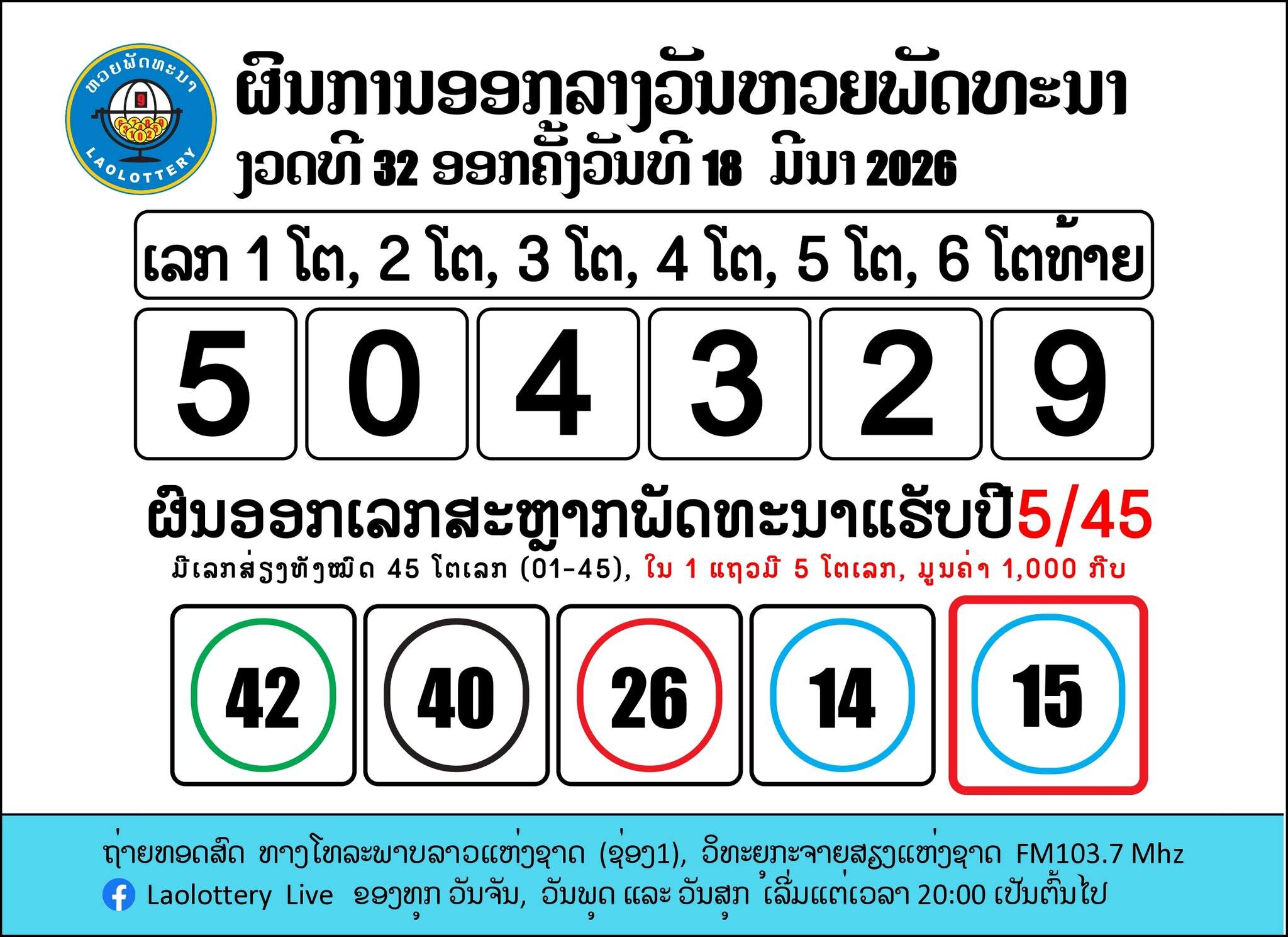สรุปผลการออกรางวัลสลากกินแบ่งรัฐบาล สปป.ลาว หรือ หวยพัฒนา ภายใต้การกำกับของกระทรวงการเงิน งวดล่าสุดวันที่ 18 มีนาคม 2569 ผลรางวัลทั้งหมดมีดังนี้