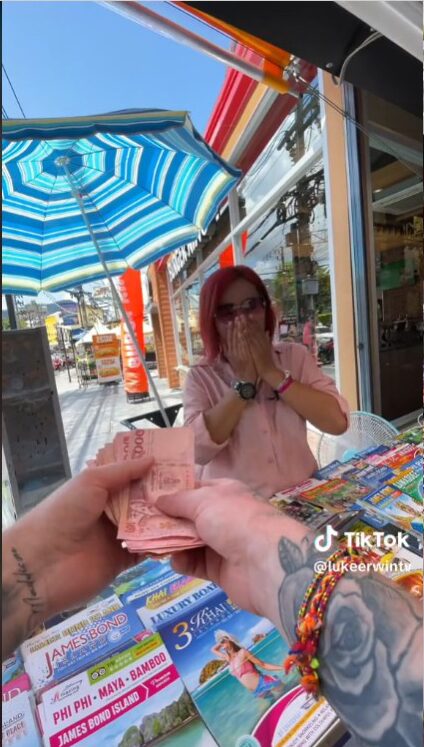 ก่อนจะตอบแทนหญิงสาวคนดังกล่าว ที่ทำเอาสาวถึงกับน้ำตาไหล เพราะหนุ่มต่างชาติยื่นธนบัตรสกุลเงินไทยให้เป็นจำนวนมาก ตอบแทนความมีน้ำใจที่เธอมอบให้ ซึ่งในตอนแรกเธอปฏิเสธ เพราะเป็นเงินจำนวนมาก และเธอช่วยเหลือเขาด้วยความเต็มใจ