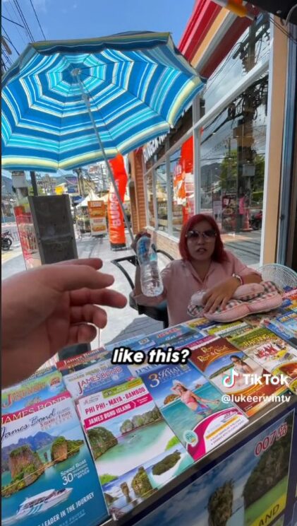 ด้านหญิงสาวที่กำลังนั่งทำงานอยู่ก็ตอบว่า"หากคุณต้องการซื้อน้ำดื่ม ให้เดินย้อนกลับไป ไม่กี่นาที จะเจอร้านสะดวกซื้อ จะสามารถซื้อน้ำดื่มได้ ราคาประมาณ 7-10 บาท" หนุ่มชาวต่างชาติก็ตอบกลับแบบลองใจว่า"ผมไม่มีเงินซื้อน้ำเปล่า"
