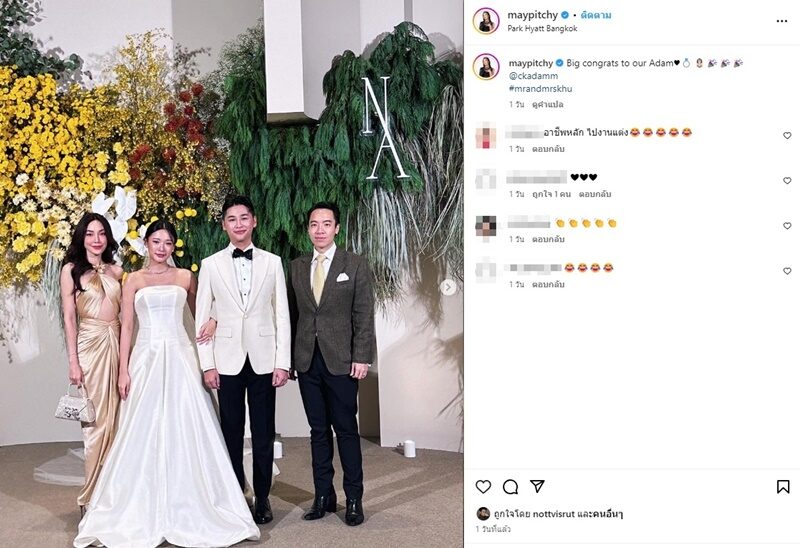 ท่ามกลางครอบครัวและเพื่อนๆในและนอกวงการร่วมยินดี เมย์ พิญช์นาฏ ก็โพสต์ภาพควง บิ๊ก สามีไปร่วมยินดี ด้วย พร้อมแคปชั่นว่า Big congrats to our Adam เป็นต้น