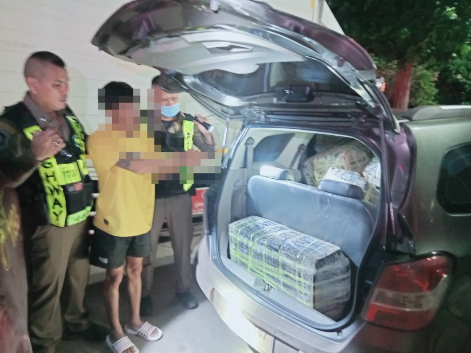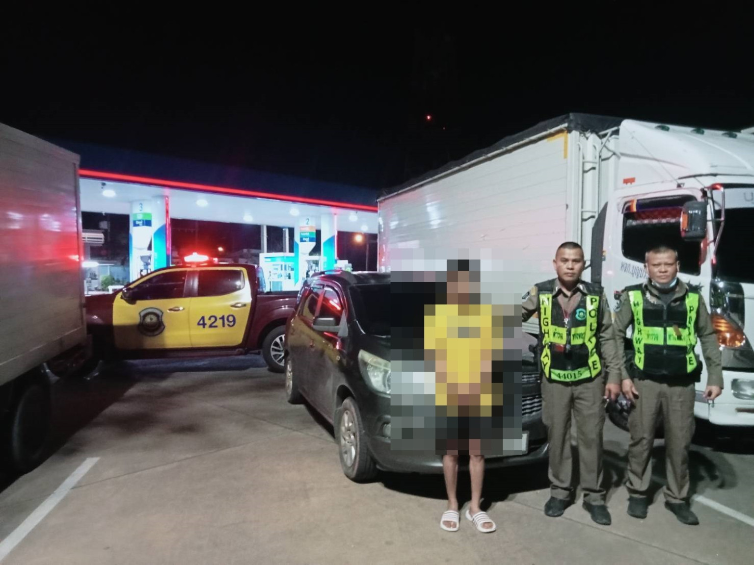 จากการตรวจสอบภายในรถไม่พบสิ่งของผิดกฎหมาย แต่หญิงคนดังกล่าวมีลักษณะท่าทางพิรุธ เนื่องจากขณะที่เจ้าหน้าที่ทำการตรวจสอบ หญิงคนดังกล่าวพยายามพิมพ์ข้อความทางโทรศัพท์หาใครอยู่ตลอดเวลา เจ้าหน้าที่ตำรวจชุดจับกุมจึงเชื่อว่าน่าจะมีรถที่ขนสิ่งของผิดกฎหมายขับตามมาด้านหลัง และแจ้งให้หญิงคนดังกล่าวเดินทางต่อไป จากนั้นเจ้าหน้าที่ตำรวจชุดจับกุมได้จึงได้ขับรถย้อนกลับเข้าไปตรวจสอบภายในปั๊ม ปตท.พระยืน ซึ่งอยู่ห่างไปประมาณ 1 กม. เมื่อไปถึงเจ้าหน้าที่ตำรวจชุดจับกุม พบรถยนต์เก๋ง ยี่ห้อ Chevrolet สีเทา หมายเลขทะเบียน กอ 187 ลพบุรี จอดอยู่ภายในปั๊ม มีลักษณะท่าทางพิรุธ จึงได้ทำการตรวจสอบบริเวณโดยรอบ ไม่พบผู้ขับขี่จึงใช้ไฟฉายส่องเข้าไปในรถคันดังกล่าว พบก้อนสี่เหลี่ยมสีดำหลายก้อน อยู่ภายในรถ จึงได้ทำการตรวจสอบพื้นที่บริเวณโดยรอบ พบผู้ต้องหา กำลังเดินออกมาจากห้องน้ำภายในปั๊ม เมื่อผู้ต้องหาเห็นเจ้าหน้าที่ตำรวจชุดจับกุมจึงมีอาการตกใจและได้วิ่งหลบหนี เจ้าหน้าตำรวจชุดจับกุมจึงไล่ติดตามและสามารถควบคุมตัวไว้ได้ สอบถาม ผู้ต้องหารับว่าตนเป็นคนขับรถคันดังกล่าวมาเอง เจ้าหน้าที่ตำรวจชุดจับกุมจึงได้ทำกาขอรตรวจค้นรถ
