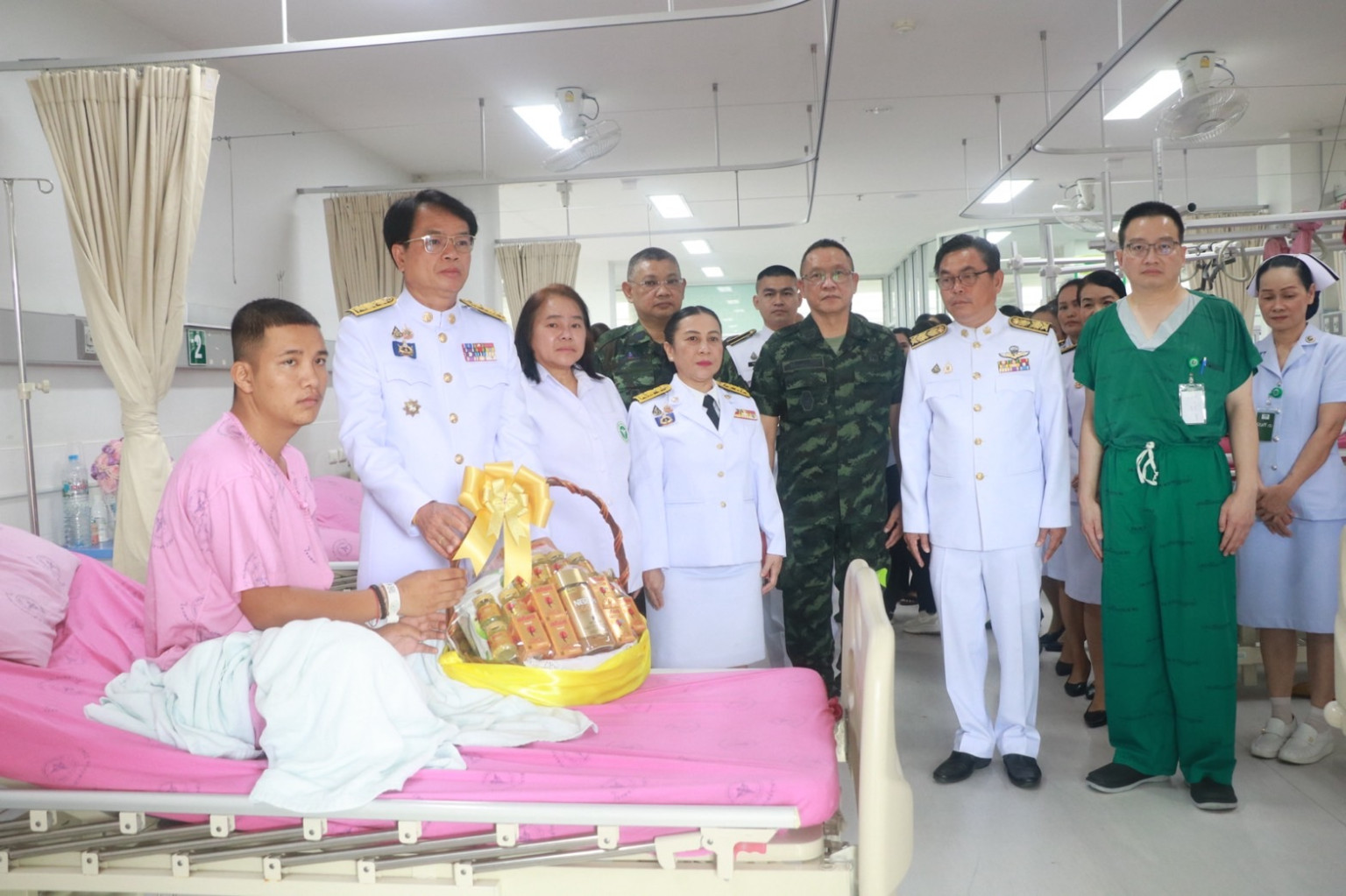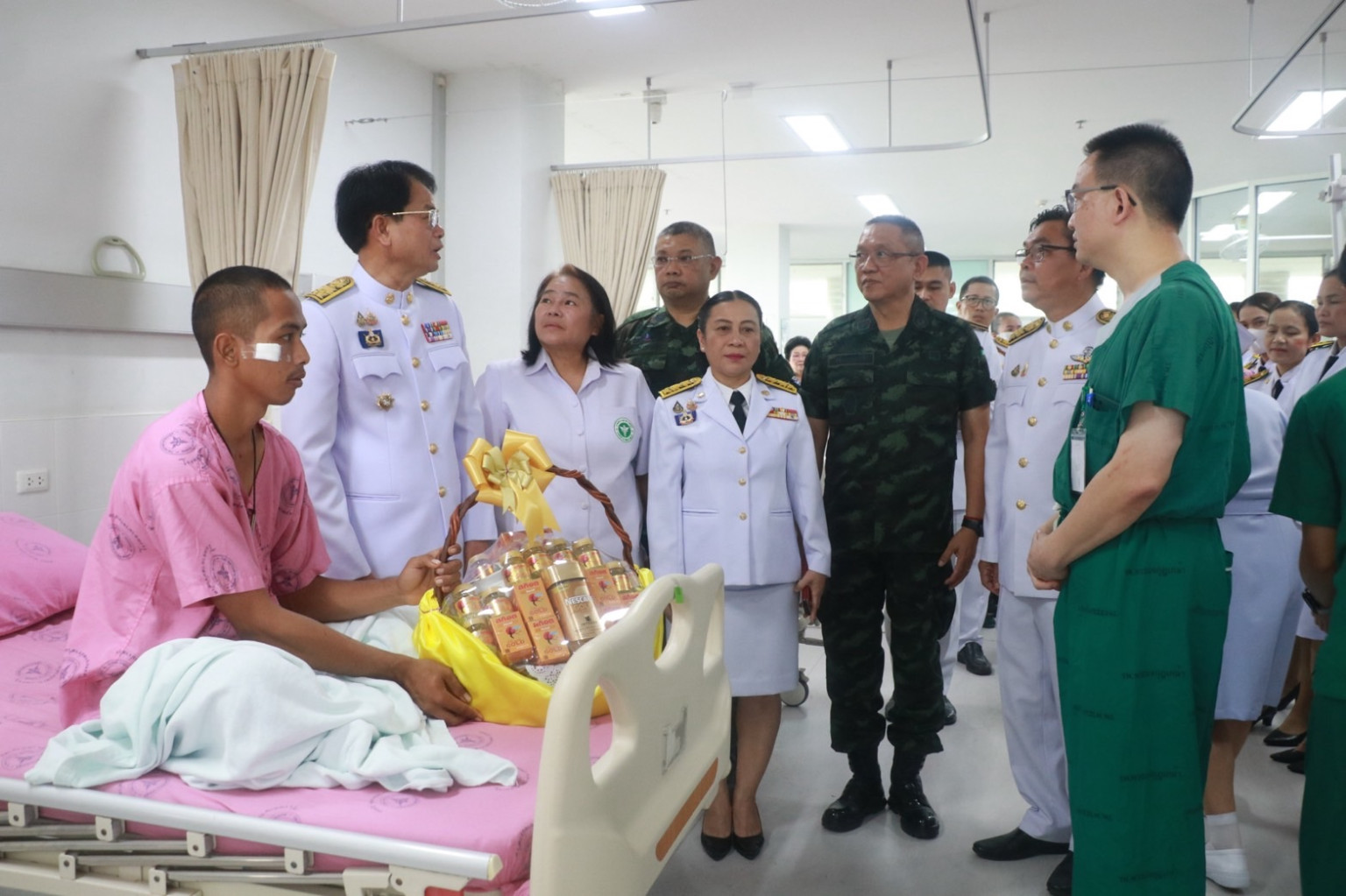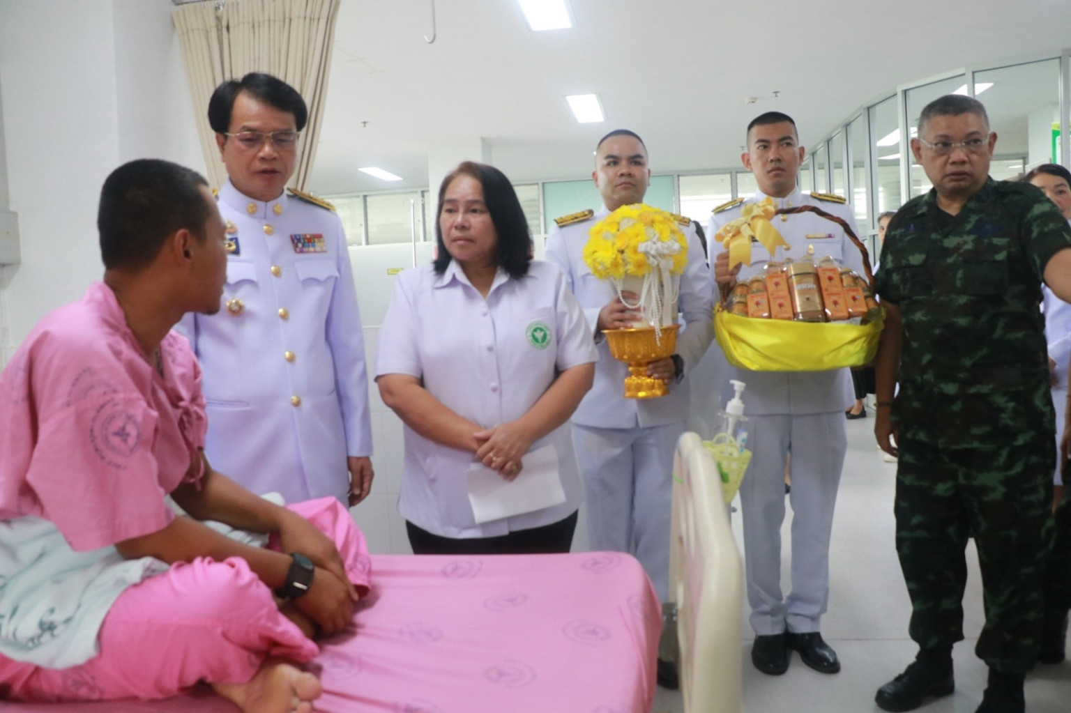 วันที่ 29 กรกฎาคม 2568 เวลา 09.00 น. พระบาทสมเด็จพระเจ้าอยู่หัว ทรงพระกรุณาโปรดเกล้า โปรดกระหม่อมให้ นายชำนาญ ชื่นตา ผู้ว่าราชการจังหวัดสุรินทร์ เชิญดอกไม้และตะกร้าสิ่งของพระราชทาน ของพระบาทสมเด็จพระเจ้าอยู่หัว และสมเด็จพระนางเจ้า ฯ พระบรมราชินี ไปมอบแก่ จ่าสิบเอก จำลอง ทองถม พลทหาร ณัฐพงษ์ ศรีวิไล พลทหารธนพัฒน์ คงเจริญ พลทหาร ชนะชัย ปานสา พลทหาร กิตติพันธ์ ทองศรี และพลทหาร อรรถพล เขียวหลง กำลังพลที่ได้รับบาดเจ็บจากเหตุการณ์ความไม่สงบในพื้นที่จังหวัดชายแดนไทย – กัมพูชา และเข้ารับการรักษาพยาบาล ณ โรงพยาบาลปราสาท อ.ปราสาท จ.สุรินทร์
