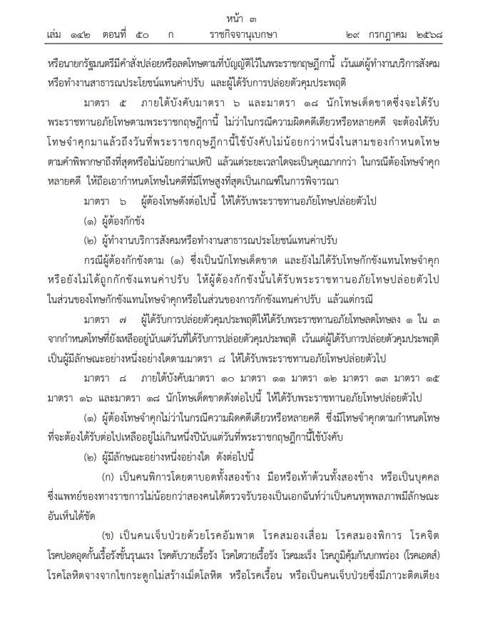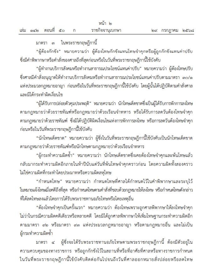 ราชกิจจานุเบกษา เผยแพร่ พระราชกฤษฎีกา พระราชทานอภัยโทษ พ.ศ.2568