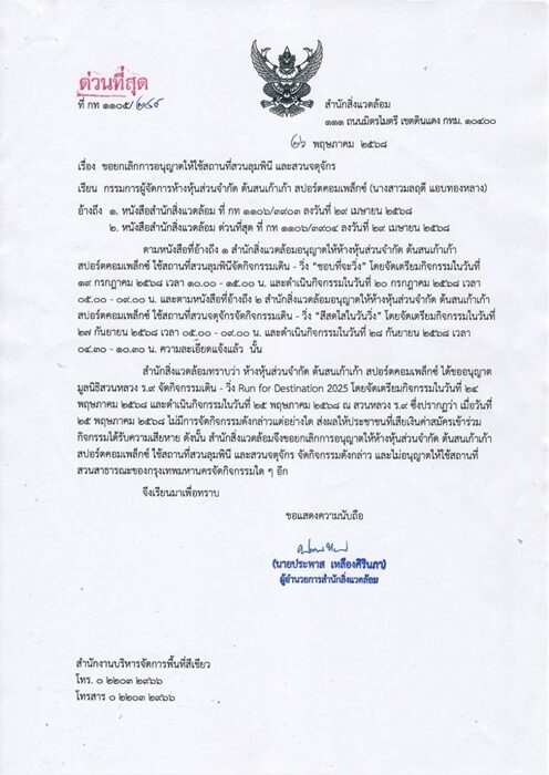 จัดกิจกรรมดังกล่าว และไม่อนุญาตให้ห้างหุ้นส่วนจำกัด ต้นสน 99 สปอร์ตคอมเพล็กซ์ ใช้สถานที่สวนสาธารณะของกรุงเทพมหานครทำกิจกรรมใด ๆ อีก ลงวันที่ 26 พ.ค.68