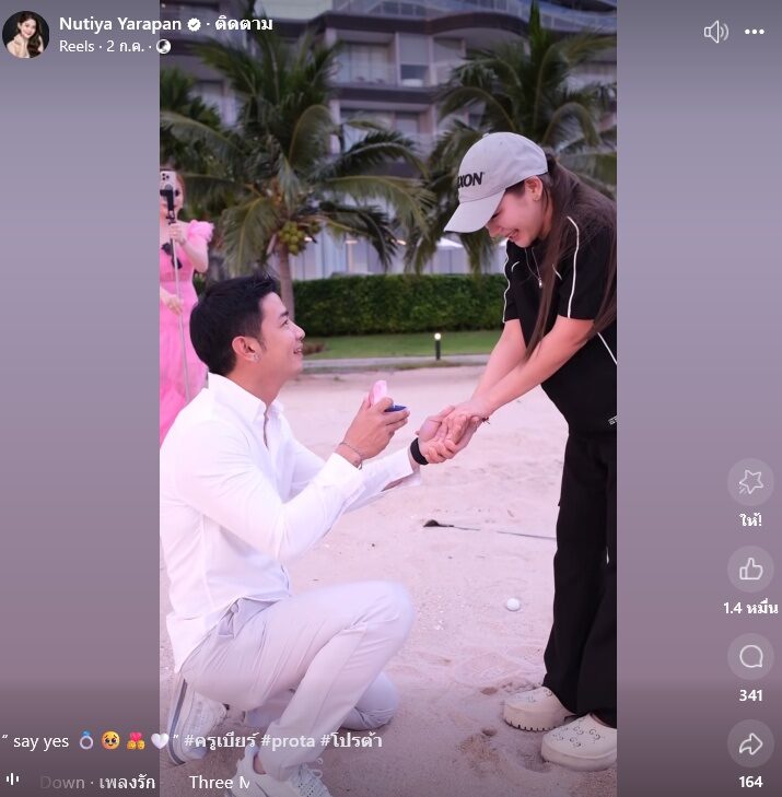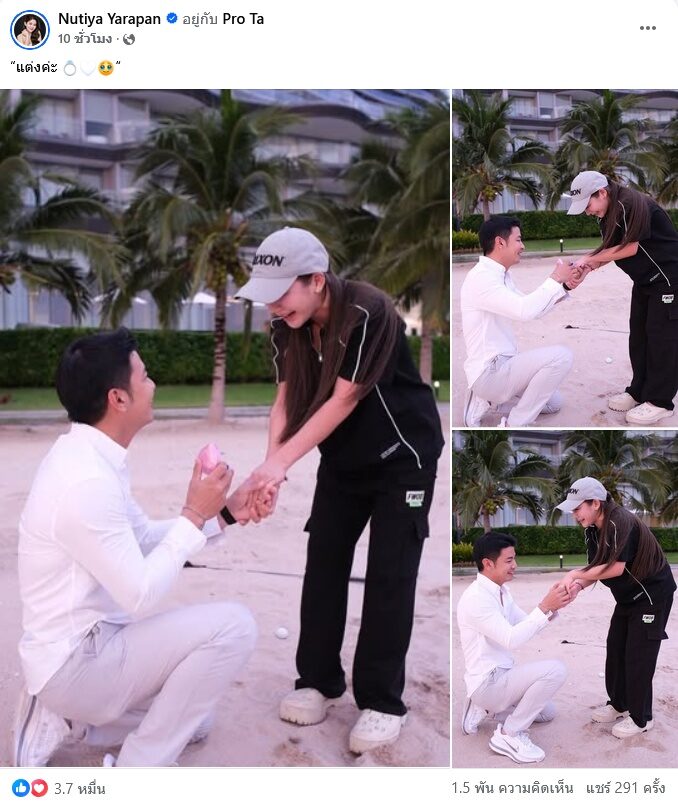 ก่อน ครูเบียร์ จะโพสต์ภาพโมเมนต์สำคัญในชีวิต โปรต้า ขอแต่งงาน พร้อมแคปชั่นตอบตกลงว่า “แต่งค่ะ” ท่ามกลางเพื่อนๆ คนดัง แฟนๆ เข้ามาร่วมแสดงความยินดีกันรัวๆ