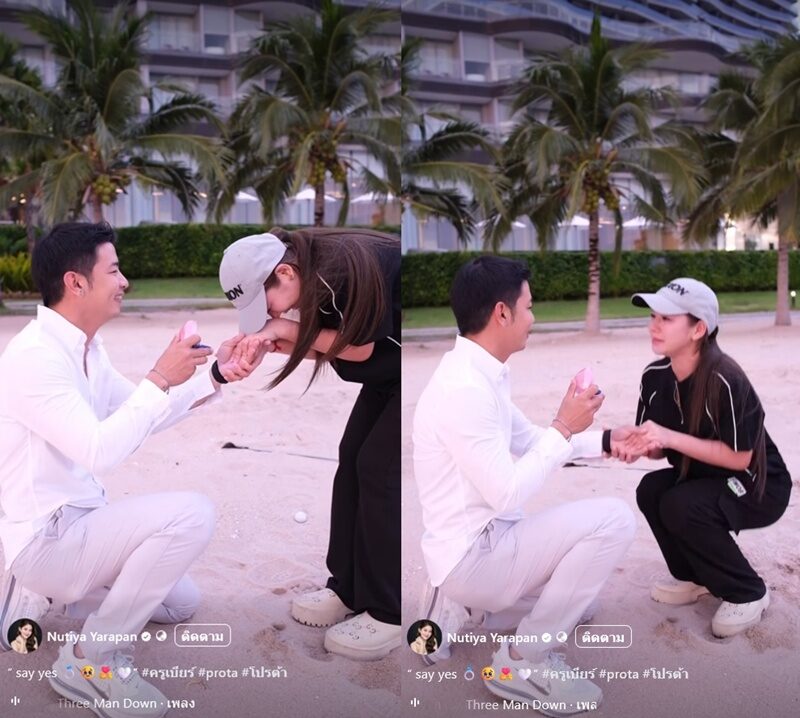 ล่าสุดเผย คลิป โมเมนต์สุดเซอร์ไพรส์ เมื่อ โปรต้า ทำเซอร์ไพรส์ ครูเบียร์ ขณะตีกอล์ฟกันอยู่ริมหาดทราย แล้วคุกเข่าขอ ครูเบียร์ แต่งงาน ทำเอา ครูเบียร์ เซอร์ไพรส์หนักร้องลั่นว่า อะไรอ่ะ ก่อนจะยื่นมือซ้ายไป ด้วยความทั้งตกใจ ดีใจ สุดกลั้นน้ำตาร้องไห้เลย