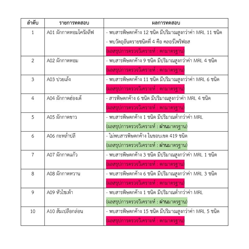 ทั้งนี้ ในบรรดาตัวอย่างที่ตรวจพบ มีเพียงกะหล่ำปลีที่ไม่พบสารตกค้างใด ๆ ขณะที่ผักกาดขาวและหัวไชเท้าพบสารตกค้างต่ำกว่าค่ามาตรฐาน ส่วนผักที่เหลือทั้งหมดมีสารตกค้างเกินค่ามาตรฐาน รวมถึงบางตัวอย่างที่พบมากถึง 12 ชนิดในรายการเดียว ซึ่งอาจส่งผลร้ายแรงต่อสุขภาพ ทั้งก่อมะเร็ง รบกวนฮอร์โมน เป็นพิษต่อประสาท ระบบสืบพันธุ์ และระบบภูมิคุ้มกัน
