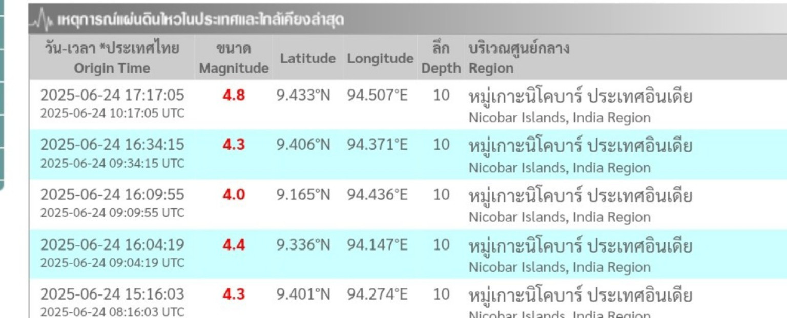 วันที่ 24 มิ.ย.68 กองเฝ้าระวังแผ่นดินไหวประเทศไทย กรมอุตุนิยมวิทยา รายงานความเคลื่อนไหวแผ่นดินไหวตามข้อมูลบันทึกการเกิดเหตุแผ่นดินไหวว่า ได้เกิดเหตุแผ่นดินไหวช่วงเวลา15.16น.ขนาดควมรุนแรง 4.3ริกเตอร์ ความลึก 10กม.ที่หมู่เกาะนิโคบาร์ ประเทศอินเดีย จากนั้นได้เกิดแผ่นดินไหวต่อเนื่องถัดมาอีก 4ครั้งในจุดเดียวกันได้แก่เวลา 16.04น. แผ่นดินไหวความรุนแรง4.4ริกเตอร์ ความลึก10กม. ถัดมาเวลา 16.09น.แผ่นดินไหว4.0ริกเตอร์ ความลึก 10กม. ถัดมาก็เกิดแผ่นดินไหวอีกในเวลา 16.34น.ขนาดความแรง4.3ริกเตอร์ ขนาดความลึก 10กม. และล่าสุดเวลา 17.17น.แผ่นดินไหว4.8ริกเตอร์ ความลึก10กม.