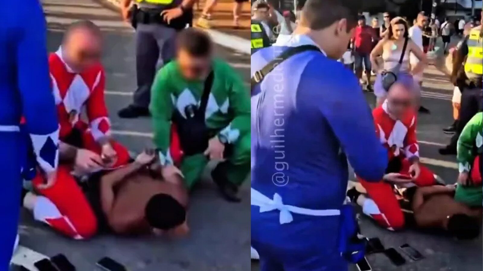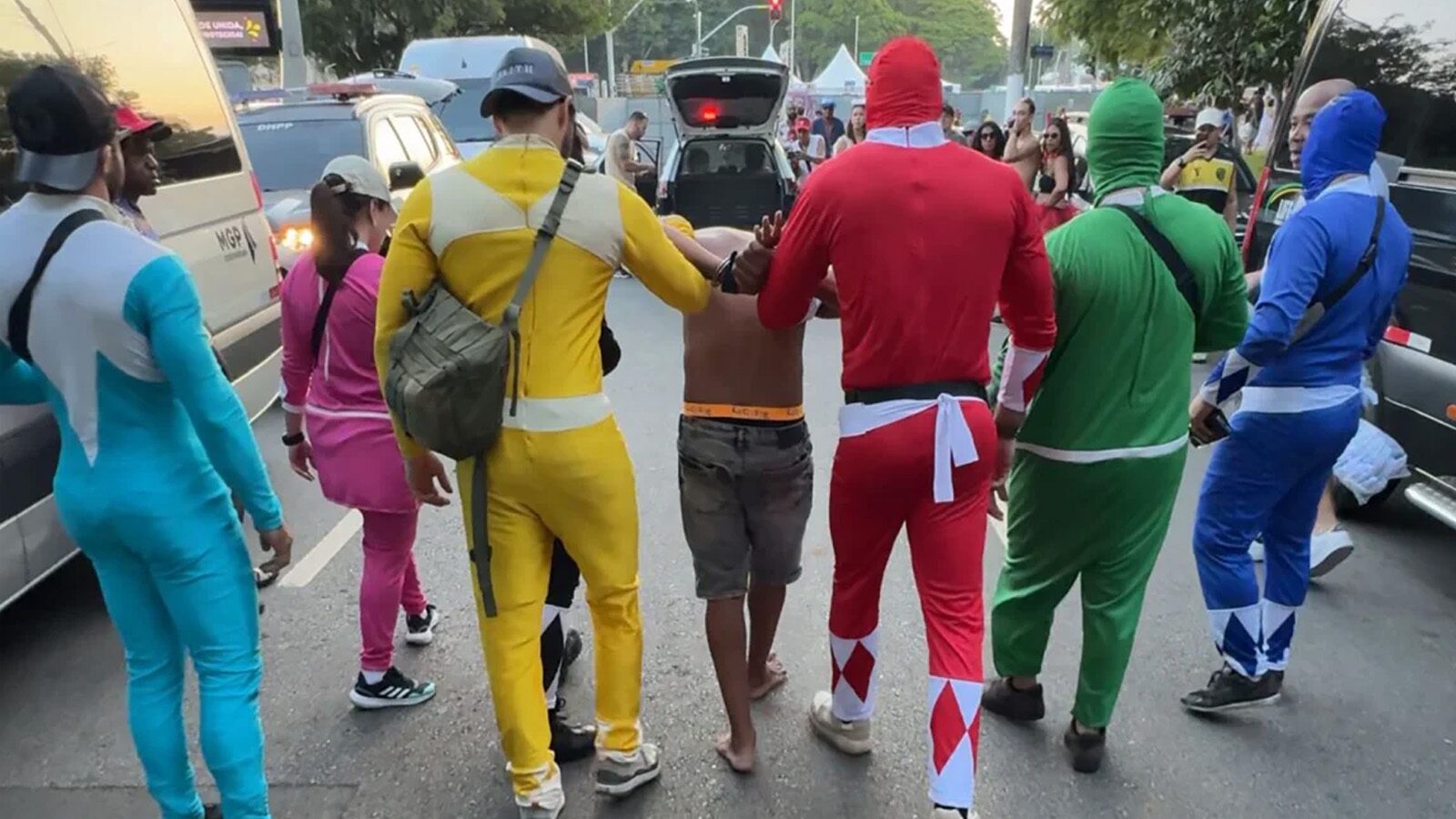 จากภาพที่เผยแพร่โดยเจ้าหน้าที่เซาเปาโล แสดงให้เห็นแก๊งพาวเวอร์เรนเจอร์กลุ่มหนึ่งกำลังควบคุมตัวของผู้ต้องสงสัยที่คาดว่าเป็นหัวขโมย ท่ามกลางเสียงเชียร์ของฝูงชนที่ร่วมงานคาร์นิวัล