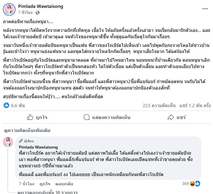 พร้อมทั้งยังคอมเมนต์ใต้โพสต์อีกว่า “พี่สาวโรเบิร์ต อยากได้เจ้าชายอดัมป์ แต่สภาพไม่เอื้อ ได้แค่ติ๊ต่างไปเองว่าเจ้าชายอดัมป์จะเอา พอพี่สาวหนูนา พี่มอลลี่&พี่แบร์แบร์ ฟาด พี่สาวโรเบิร์ตเลยเปิดแชทที่เจ้าชายคุยด้วย ซึ่งแชทน่าจะ8-9ปีที่ผ่านมาแล้ว พี่มอลลี่ และพี่แบร์แบร์ งง ไปเลยยยย เป็นเอาหนักเหมือนกันนะพี่สาวโรเบิร์ต”