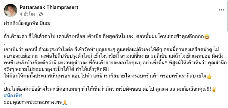 ล่าสุด นายภัทรศักดิ์ เทียมประเสริฐ หรือ เก่ง ซึ่งคนเคยรู้สึกในฉายา เก่งเกียร์อาร์ ซึ่งเคยเป็นข่าว ถอยชนรถคู่กรณีจนพังยับเมื่อหลายปีที่ผ่านมา ได้ออกมาโพสต์ถึง นายพีช โดยระบุว่า "ฝากถึงน้องลูกพีช บีเอ็ม ถ้าเค้าจะด่า ก็ให้เค้าด่าไป เด่วเค้าเหนื่อย เค้าเบื่อ ก็หยุดกันไปเองตอนนั้นผมโดนเยอะฟ่าคุณอีกกกก