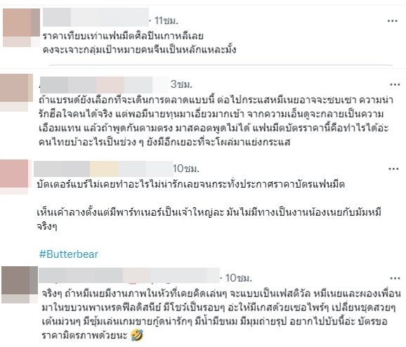 , "ราคาเทียบเท่าแฟนมีตศิลปินเกาหลีเลย คงจะเจาะกลุ่มเป้าหมายคนจีนเป็นหลักแหละ", "จริง ๆ ถ้าหมีเนยมีงานภาพในหัวที่เคยคิดเล่นๆ