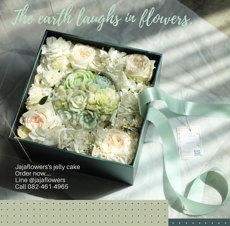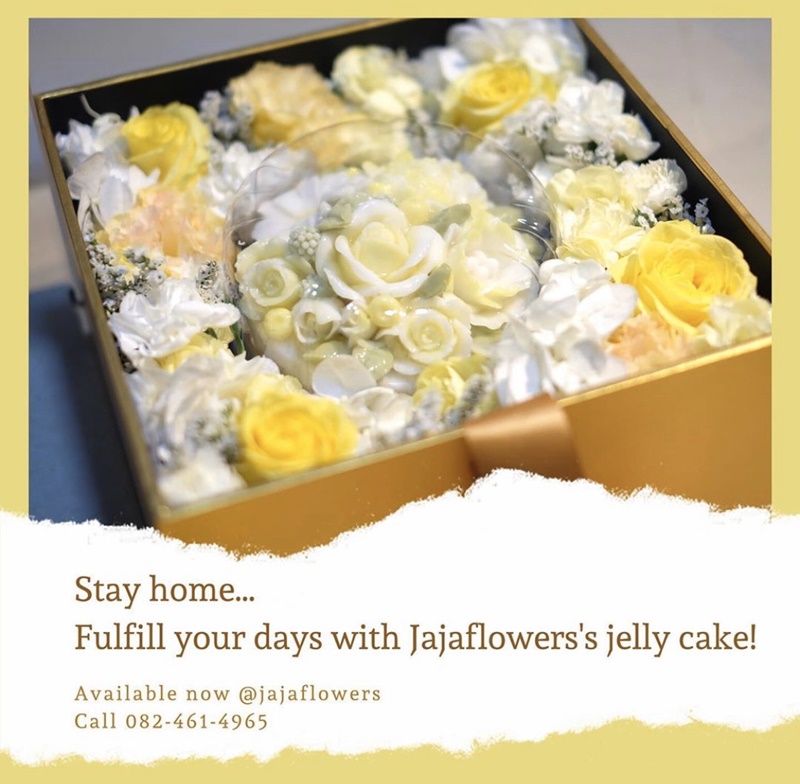 “จ๋าเลยปรับกลยุทธ์มาเป็นดอกไม้กินได้ ซึ่งเพิ่งมาปรับตอนที่มีวิกฤตโควิด-19 นี้เลย ปกติร้านจ๋าจะขายดอกไม้สดและดอกไม้ประดิษฐ์ คราวนี้พอกลับมาเป็นดอกไม้กินได้ก็คือเอาวุ้นมะพร้าวน้ำหอม ซึ่งคุณป้าของจ๋าทำอยู่แล้ว ข้างบ้านก็จะมีส่วนมะพร้าวน้ำหอม หลังบ้านมีใบเตยเลยเอามะพร้าวน้ำหอมกับใบเตยมาทำเป็นวุ้นสูตรออร์แกนิก ซึ่งเป็นสูตรหวานน้อย ปกติวุ้นมันก็จะเป็นสี่เหลี่ยม มีเป็ดมีอะไร แต่เราเพิ่มความมีมิติของมันด้วยการเอาพิมพ์ดอกไม้มาทำให้มีดอกไม้เต็มหน้าวุ้นเลย แล้วก็หากล่องมา จากนั้นนำดอกไม้สดที่เรามีมาประดับรอบๆ ก็กลายเป็นกล่องดอกไม้กินได้”
