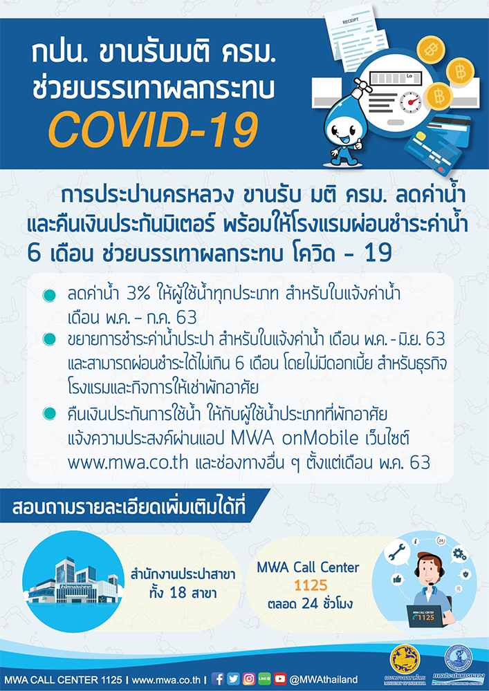 1. ลดค่าน้ำ 3% ให้กับผู้ใช้ทุกประเภท นาน 3 เดือน คือเดือนพฤกษภาคม-กรกฎาคม 2563
