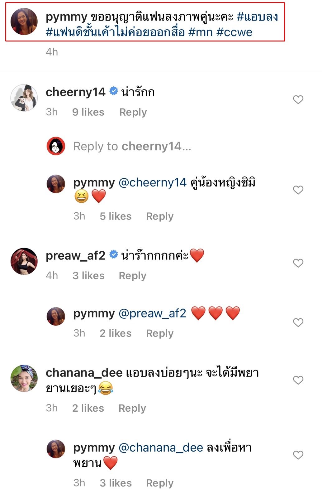 โดย สาวพิมพ์ โพสต์ภาพคู่นั่งแนบชิด พร้อมแคปชั่นว่า “ขออนุญาตแฟนลงภาพคู่นะคะ #แอบลง #แฟนดิชั้นเค้าไม่ค่อยออกสื่อ #mn #ccwe” งานนี้ทำเอาแฟนๆ ที่ติดตามฮือฮากันใหญ่เพราะไม่เคยทราบมาก่อนว่าดาราสาวขวัญใจมีแฟน ในขณะที่เพื่อนพ้องในวงการต่างเข้ามาแซว พร้อมกับเชียร์ว่าให้แอบลงบ่อยๆ จะได้มีพยานเยอะๆ
