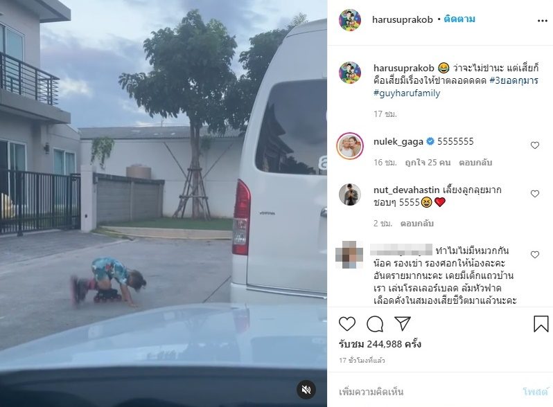 เตือนอันตราย -ฮารุ โพสต์คลิปน้องเอเดน ลูกชายคนเล็กกำลังหัดเล่นสเก็ต พร้อมเผยด้วยว่า “ว่าจะไม่ขำนะ แต่เสี่ยก็คือเสี่ยมีเรื่องให้ขำตลอดดดด #3ยอดกุมาร #guyharufamily”