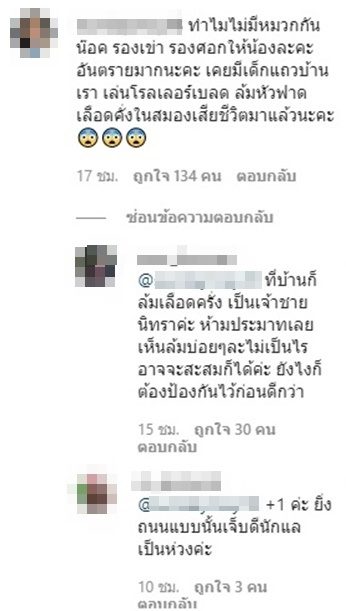 “ที่บ้านก็ล้มเลือดคั่ง เป็นเจ้าชายนิทราค่ะ ห้ามประมาทเลย เห็นล้มบ่อยๆละไม่เป็นไร อาจจะสะสมก็ได้ค่ะ ยังไงก็ต้องป้องกันไว้ก่อนดีกว่า” , “คุณแม่ใส่หมวกกันน็อค ที่รองเข่า ที่รองข้อศอกให้น้องด้วยนะคะ กลัวน้องล้มแล้วมีแผลค่ะ น้องเก่งมากเลยค่ะ” , “แม่ขอสนับเข่าหน่อยย 555555 พี่เดนลู๊กก เก่งมากก ไม่กลัวอะไรเลย นี่แอบกรี้ดด้วยตอนเสี่ยล้ม ไม่ร้องเลยลู๊กเอ้ยย #จิ้บๆเนอะ” เป็นต้น
