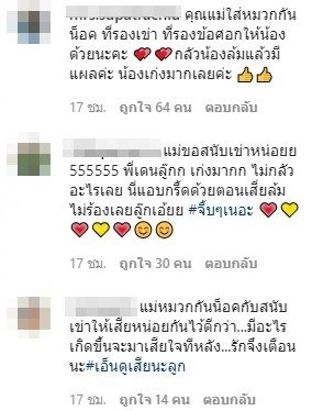 ณัฏฐ์ เทพหัสดิน เข้ามาคอมเมนต์ “เลี้ยงลูกลุยมาก ชอบๆ 5555” ขณะที่มีแฟนคลับและชาวเน็ตจำนวนมากเข้ามาคอมเมนต์แห่เป็นห่วงและเตือนให้เซฟน้องเอเดน อาทิ “ทำไมไม่มีหมวกกันน๊อค รองเข่า รองศอกให้น้องละคะ อันตรายมากนะคะ เคยมีเด็กแถวบ้านเรา เล่นโรลเลอร์เบลด ล้มหัวฟาด เลือดคั่งในสมองเสียชีวิตมาแล้วนะคะ”