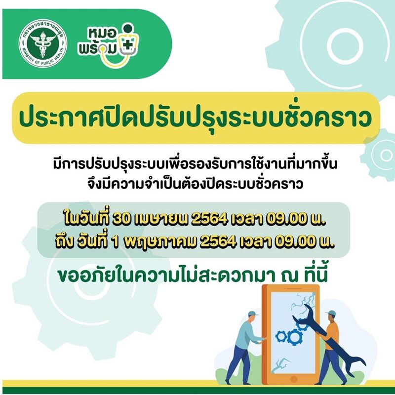 ปรากฏว่าล่าสุดวันที่ 30 เม.ย.2564 กระทรวงสาธารณสุข เผยแพร่ภาพกราฟิกแจ้งประกาศปิดปรับปรุงระบบหมอพร้อมชั่วคราว โดยระบุว่า ปิดปรับปรุงระบบเพื่อรองรับการใช้งานที่มากขึ้น จึงมีความจำเป็นต้องปิดระบบชั่วคราว ในวันที่ 30 เม.ย. เวลา 09.00 น. ถึงวันที่ 1 พ.ค. เวลา 09.00 น. จึงขออภัยในความไม่สะดวกมา ณ ที่นี้