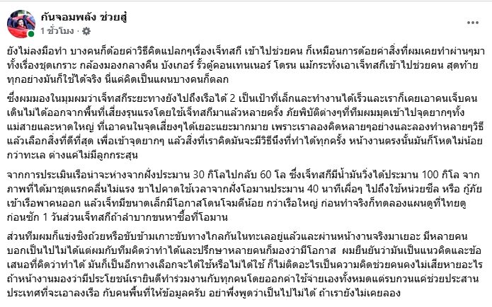 ซึ่งผมมองในมุมผมว่าเจ็ตสกีระยะทางยังไปถึงเรือได้ 2 เป็นเป้าที่เล็กและทำงานได้เร็วและเราก็เคยเอาคนเจ็บคนเดินไม่ได้ออกจากพื้นที่เสี่ยงรุนแรงโดยใช้เจ็ตสกีมาแล้วหลายครั้ง ภัยพิบัติต่างๆที่ทีมผมมุดเข้าไปจุดยากๆทั้งแม่สายและหาดใหญ่ ที่เอาคนในจุดเสี่ยง ๆ ได้เยอะแยะมากมาย เพราะเราลองคิดหลายๆอย่างและลองทำหลาย ๆ วิธีแล้วเลือกสิ่งที่ดีที่สุด เพื่อเข้าจุดยาก ๆ แล้วสิ่งที่เราคิดมันจะมีวิธีนึงที่ทำได้ทุกครั้ง หน้างานตรงนั้นมันก็โหดไม่น้อยกว่าทะเล ต่างแค่ไม่มีลูกกระสุน