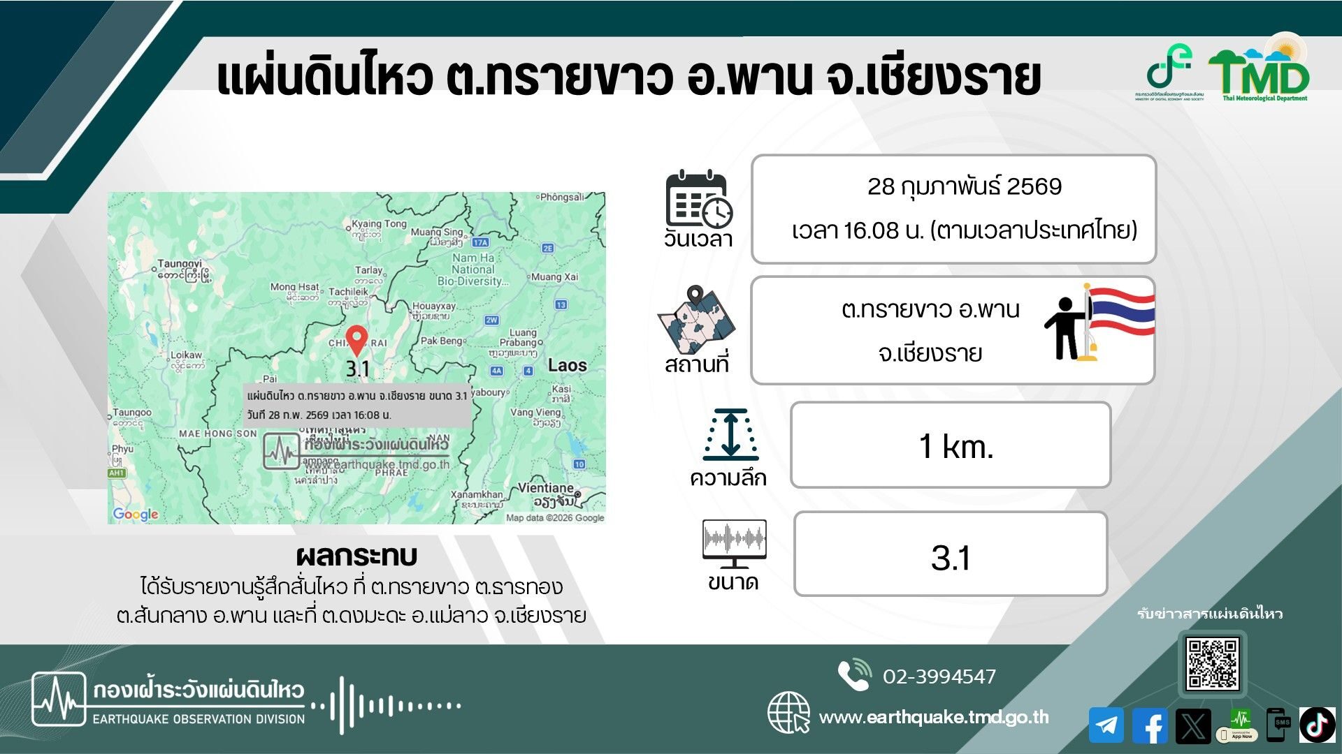 วันที่ 28 ก.พ. 2569 กองเฝ้าระวังแผ่นดินไหว กรมอุตุนิยมวิทยา แจ้งว่า เกิดเหตุได้ประกาศ แผ่นดินไหวในพื้นที่ ต.ทรายขาว อ.พาน จ.เชียงราย เมื่อเวลา 16.08 น. ที่ผ่านมา ขนาด 3.1 ความลึก 1 กิโลเมตร
