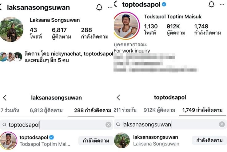 ล่าสุดก็มีแฟนคลับหลายไปแอบส่องอินสตาแกรม คุณแม่ของสาวก้อย อรัชพร ก็พบว่าคุณแม่ได้กดติดตามอินสตาแกรมของหนุ่มท็อป ทศพล และ ท็อปก็ติดตามคุณแม่ด้วย ทำเอาชาวเรือแห่คอมเมนต์คว้าพายจ้ำกันต่อเลย