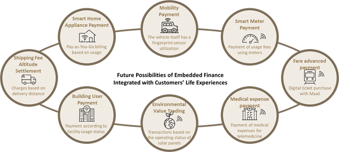 การศึกษาของ เอบีม คอนซัลติ้ง พบแนวโน้มการขยายตัวบริการทางการเงินแบบฝังตัวสำหรับการชำระเงินและสินเชื่อครอบคลุมธุรกรรมในทุกระดับมูลค่า ตั้งแต่การซื้อสินค้าชิ้นใหญ่ไปจนถึงการจับจ่ายในชีวิตประจำวัน เช่น สินค้าในซูเปอร์มาร์เก็ตและการชำระค่าสาธารณูปโภค โดยการทำธุรกรรมผ่านอุปกรณ์อัจฉริยะ (Smart Device) อื่นๆ ที่เราใช้ในชีวิตประจำวันจะมีให้เห็นมากขึ้น ไม่ว่าจะเป็นจากรถยนต์ เครื่องใช้ไฟฟ้าภายในบ้าน เครื่องใช้ในสำนักงาน โดยการรูปแบบการคิดค่าบริการจะเป็นไปในลักษณะการใช้งานจริง Pay-As-You-Go หรือ Pay-Per-Usage