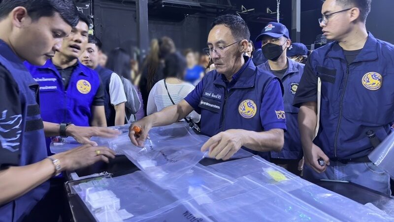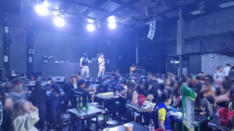 โดยกรูกันดันประตูหลบหนีออกไป แต่เจ้าพนักงานฝ่ายปกครองก็ได้ควบคุมนักเที่ยวที่เหลือไว้ได้จำนวนหนึ่ง และประกาศให้ทุกคนอยู่ในความสงบ แล้วจึงให้เจ้าพนักงาน ปปส. ภาค 7 ทำการตรวจหาสารเสพติดในปัสสาวะของนักเที่ยวทุกราย