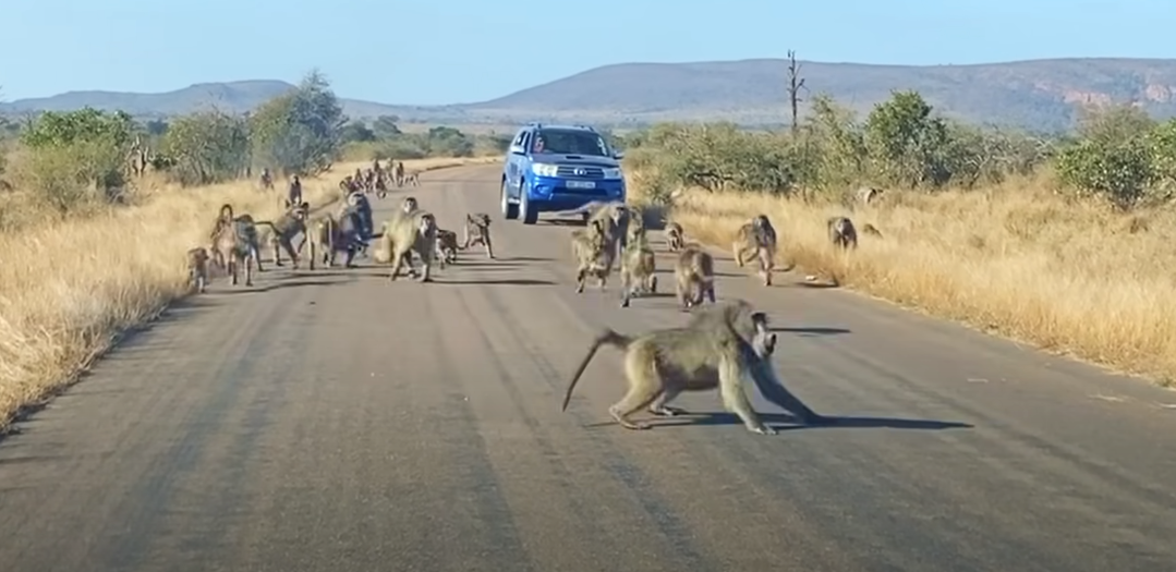 เนื่องจากฝูงลิงบาบูนมีสมาชิกประมาณ 50 ตัว ตอนแรกริกกีคิดว่าไม่มีทางที่เสือดาวจะเคลื่อนไหว แต่แล้ว "ความอยากรู้อยากเห็นของนักล่าก็ดูเหมือนจะเข้าท่า เสือดาวตัวนั้นลอบหายเข้าไปในพงหญ้าริมถนน เขาอยู่ในโหมดสะกดรอยเต็มตัว เมื่อเสือดาวเข้าใกล้ฝูงลิงบาบูน ความคาดหวังก็ลอยอยู่ในอากาศ”