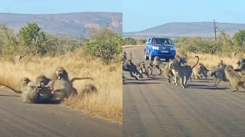 วิดีโอดังกล่าวแสดงนาทีความพยายามของเสือดาวที่จะจับอาหารง่าย ๆ อย่างจับลูกลิงตัวเล็ก ๆ แต่กลับกลายเป็นผลร้ายอย่างมากหลังจากฝูงลิงบาบูน 50 ตัวรวมตัวกันและทุบเสืออย่างจัง