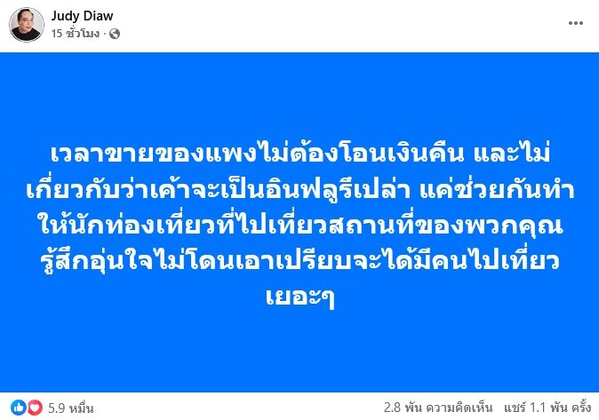 โดย จูดี้ เพื่อนสนิทพี่จอง-คัลแลน ก็โพสต์เดือดฟาดว่า “เวลาขายของแพงไม่ต้องโอนเงินคืน และไม่เกี่ยวกับว่าเค้าจะเป็นอินฟลูรึเปล่า แค่ช่วยกันทำให้นักท่องเที่ยวที่ไปเที่ยวสถานที่ของพวกคุณรู้สึกอุ่นใจไม่โดนเอาเปรียบจะได้มีคนไปเที่ยวเยอะๆ” ท่ามกลางแฟนคลับคอมเมนต์แม่ได้พูดแทนใจแล้ว เห็นด้วยกับจูดี้เลย