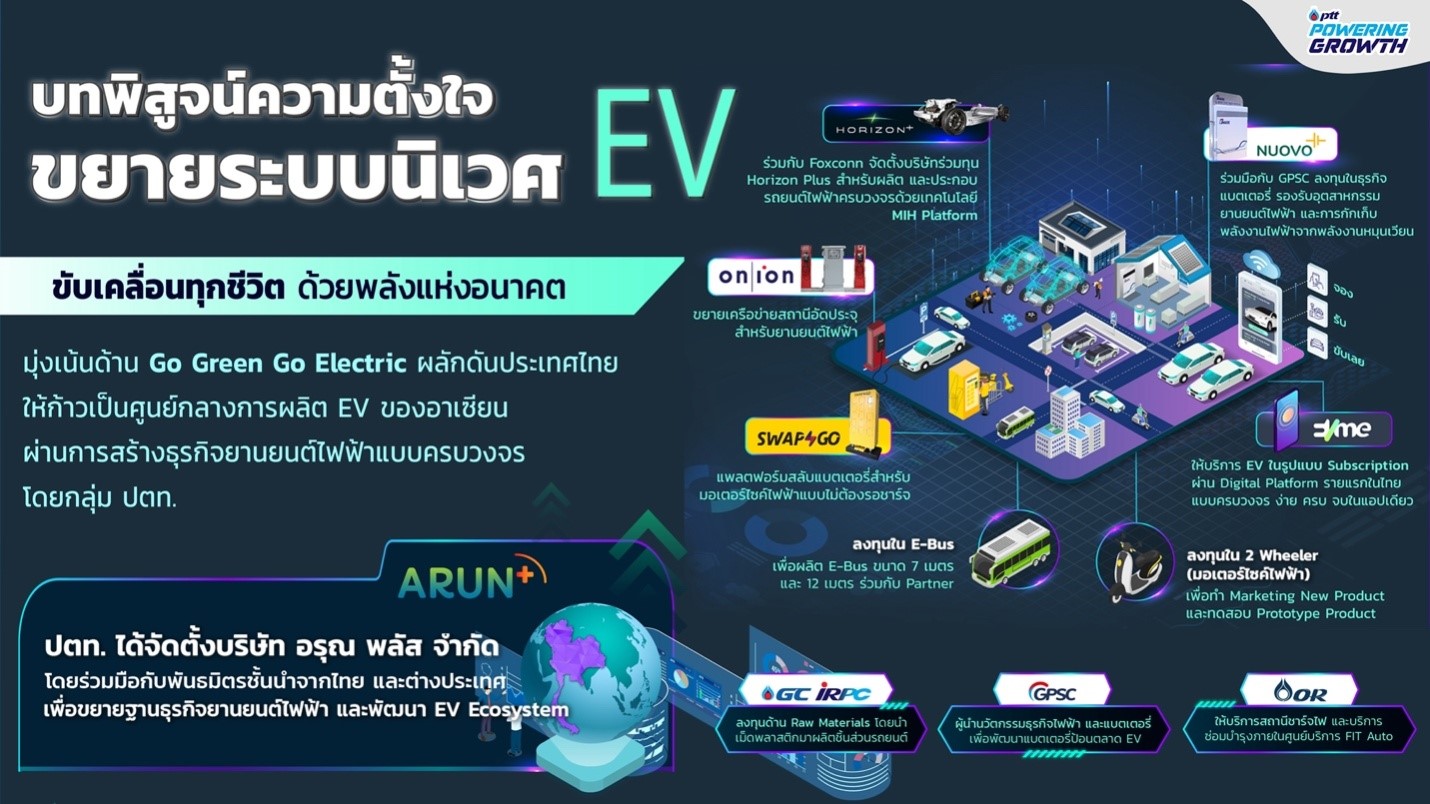 แม้ว่า อรุณพลัส (arunplus) จะก่อตั้งมาได้แค่ประมาณปีครึ่งในฐานะบริษัทย่อยของ ปตท. เพื่อดำเนินธุรกิจด้าน EV Value Chain แต่ เอกชัย เล่าว่าจริง ๆ แล้ว ปตท. ทำเรื่องอีวีมามาสักพักแล้ว เพียงแต่ทำภายในและกระจัดกระจาย ดังนั้น อรุณพลัส จึงทำหน้าที่เหมือนตัวกลางที่เชื่อมให้ทุกอย่างมารวมกันและขับเคลื่อนไปในทิศทางเดียวกัน เพื่อสนับสนุนการเปลี่ยนผ่านของผู้ประกอบการไทยในห่วงโซ่อุปทานจากเครื่องยนต์สันดาปไปสู่ยานยนต์ไฟฟ้า