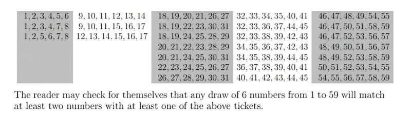 จากการจับรางวัลหกครั้งใด ๆ จะต้องปรากฏตัวเลข 2 ตัวบนโครงสร้างทางเรขาคณิตหนึ่งในห้าโครงสร้าง เพื่อให้แน่ใจว่าตัวเลขเหล่านั้นจะปรากฏบนลอตเตอรี่อย่างน้อยหนึ่งใบ ทั้งนี้ ดร.เดวิดเผยว่า จากการทำงานหนักแสดงให้เห็นว่า การจะบรรลุผลลัพธ์เดียวกันโดยใช้สลาก 26 ใบนั้นเป็นไปไม่ได้
