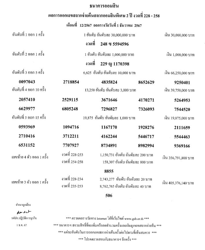 ผลการออกเลขสลากจ่ายคืนสลากออมสินพิเศษ 2 ปี งวดที่ 228-258 เดือนที่ 12/2567 ออกรางวัล วันที่ 1 ธันวาคม 2567