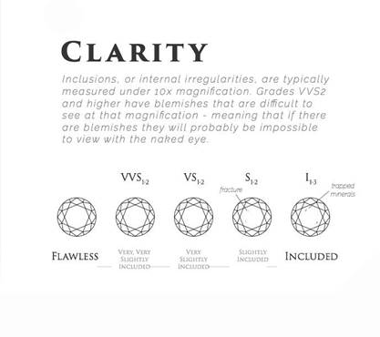Clarity (ความใส): ความใสของเพชรที่ปราศจากตำหนิ (FL) หรือมีตำหนิเล็กน้อย (VVS1-VVS2) จะเพิ่มความหรูหราให้แหวนเพชร ซึ่งยากที่จะมองเห็นด้วยตาเปล่า