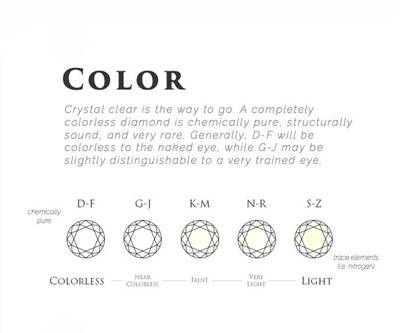 Color (สี): เพชรที่ไร้สีจัดเป็นเพชรที่มีความหรูหราในระดับสูงสุด เพชรระดับสี D-F จะมีความ