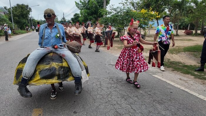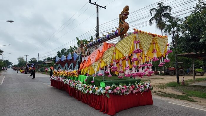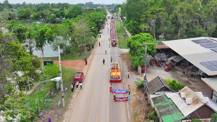 โดยช่วงเช้าได้มีการแห่ขบวนบั้งไฟสวยงาม, ผาแดง-นางไอ่, การละเล่นพื้นบ้าน และขบวนเซิ้งบั้งไฟนางรำทั้ง 10 หมู่ กว่า 300 คน เคลื่อนขบวนระยะทางกว่า 2 กิโลเมตร อย่างสนุกสนาน โดยชาวบ้านทั้งสองฝั่งทางได้ออกมารอดูขบวนแห่บุญบั้งไฟครั้งนี้จำนวนมาก เพราะเป็นงานบุญเดือน 6 บั้งไฟขอฝนที่จัดขึ้นเป็นประจำของหมู่บ้านทุกปี