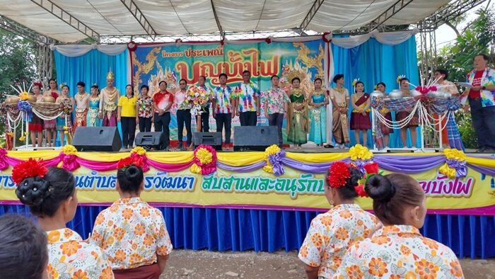 ที่ลานอ่างเก็บน้ำบ้านบึงสำราญ ม.6 ต.ถาวรวัฒนา อ.ทรายทองวัฒนา จ.กำแพงเพชร ชาวบ้านในพื้นที่ได้ร่วมกันจัดงานประเพณีบุญบั้งไฟ (บุญเดือน 6) เพื่อบูชาพญาแถน ตามความเชื่อของชาวไทยอีสานในการขอฝนให้ตกตามฤดูกาลในช่วงการทำการเกษตรไร่นา