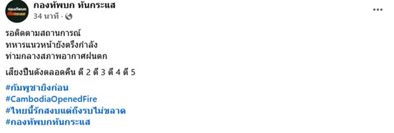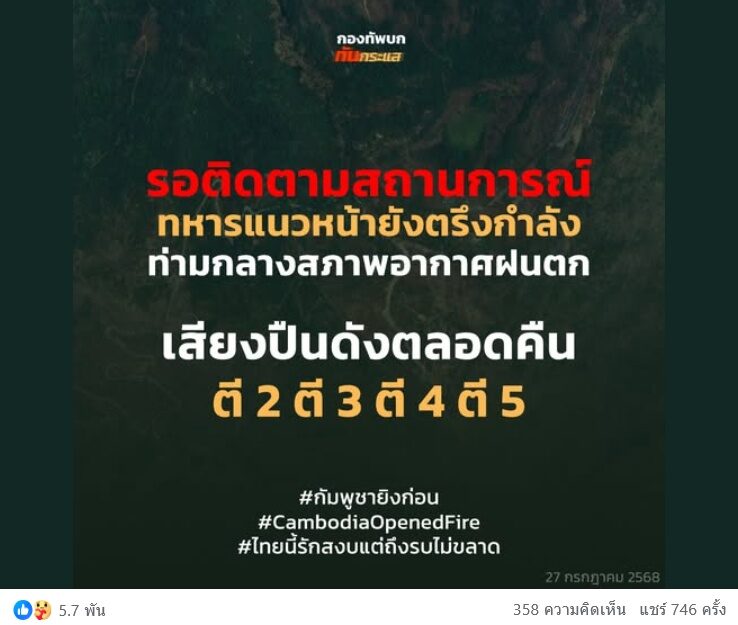 อ่านข่าวต้นฉบับได้ที่ : เช้ามืดวันนี้ กัมพูชาเปิดฉากโจมตียิงทหารไทยที่ปราสาทตาควาย วันที่ 4 เสียงปืนระเบิดสนั่น