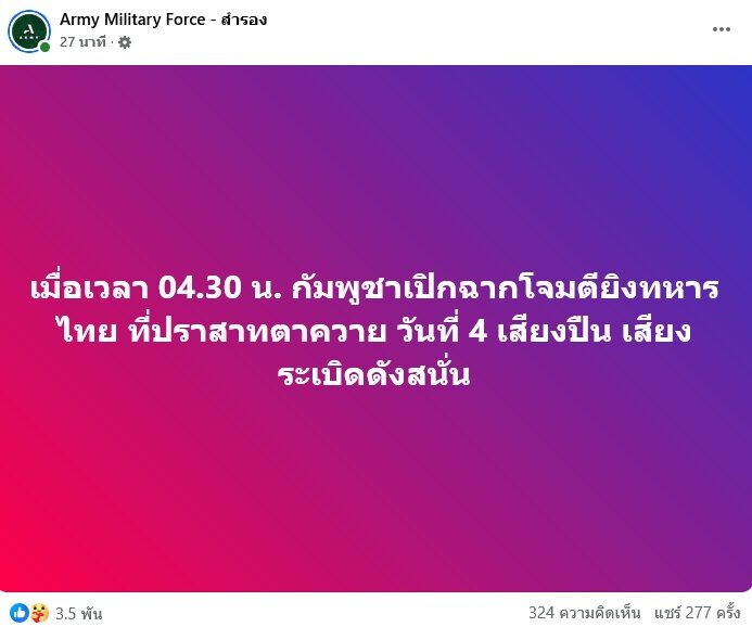 เพจของทหารArmy Military Force - สำรอง โพสต์ข้อความเช้านี้ (27 ก.ค.68) ล่าสุดว่า “เมื่อเวลา 04.30 น. กัมพูชาเปิดฉากโจมตียิงทหารไทย ที่ปราสาทตาควาย วันที่ 4 เสียงปืน เสียงระเบิดดังสนั่น”
