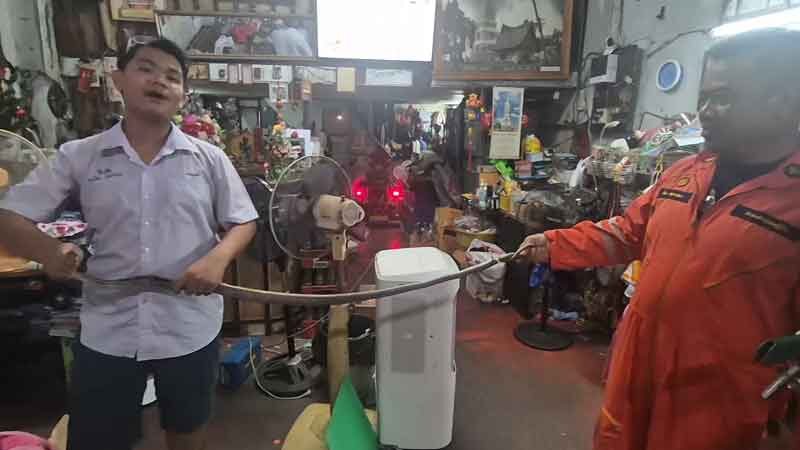 ที่เกิดเหตุอาคารพาณิชย์ 3 ชั้น 1 คูหา ที่บริเวณชั้นล่าง พบ น.ส.ภัทริน อายุ 46 ปี เจ้าของร้าน ชี้จุดที่งูเลื้อยเข้าไปใต้โต๊ะวางของภายในร้าน เจ้าหน้าที่ ได้นำกล้องส่องในที่แคบ เพื่อตรวจสอบจุดที่งูเลื้อยเข้าไป จึงทำการนำเหล็กจับงู แหย่ให้งูตกใจและเลื้อยออกมา